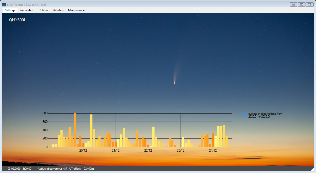 [Home] [Geo settings] [File Structure] [Object selection] [Object selection 2] [No Go Areas] [Common restrictions] [CCD Parameters] [N.I.N.A. Parameters] [ACP Parameters] [Orchestrate Parameters] [More objects] [Parking stars] [Loading] [Execute planning] [Execute search] [Revise] [Object information] [NEO Ranking] [Rejected objects] [Ephemeris details] [NEOCP Check] [Show changes] [Show Log file] [Screenshot] [Statistics] [Statistics 2023] [All observations] [NEODyS-2 Statistics] [NEO Graphical Platform] [Impressum]